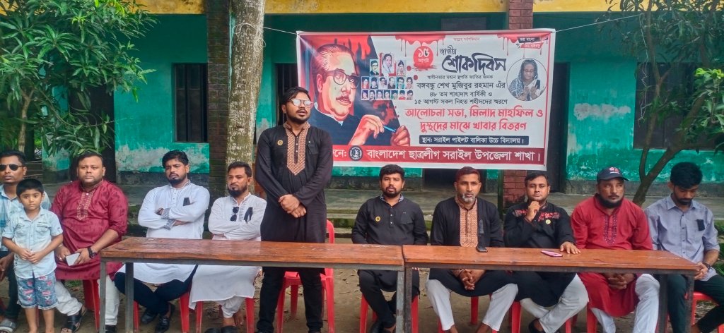 স্বাধীনতার মহান স্থপতি জাতির জনক, বঙ্গবন্ধু শেখ মুজিবুর রহমান এর ৪৮ তম শাহাদাৎ বার্ষিকী ও ১৫ আগস্ট সকল নিহত শহিদের স্মরণে, বাংলাদেশ ছাত্রলীগ, সরাইল উপজেলা শাখার পক্ষ হইতে শ্রদ্ধাঞ্জলি। আলোচনা সভা, মিলাদ মাহফিল ও গরিব দুঃখী স্কুল ছাত্র/ছাত্রী, দুস্থদের মাঝে খাবার বিতরণ করেন।